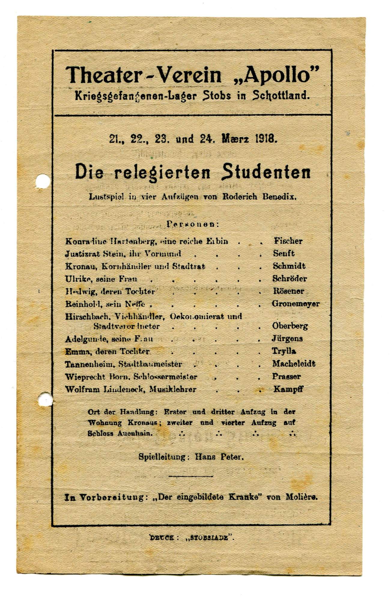 A comedy, Die relegierten Studenten [The Rusticated Student], by Roderich Benedix in four acts.